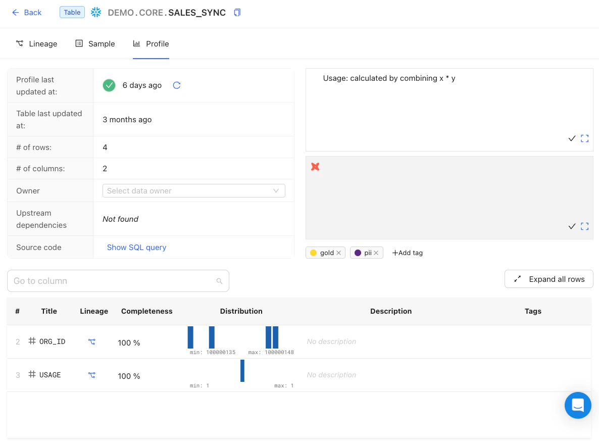 View a data profile that summarizes key table and column-level statistics, and any upstream dependencies.