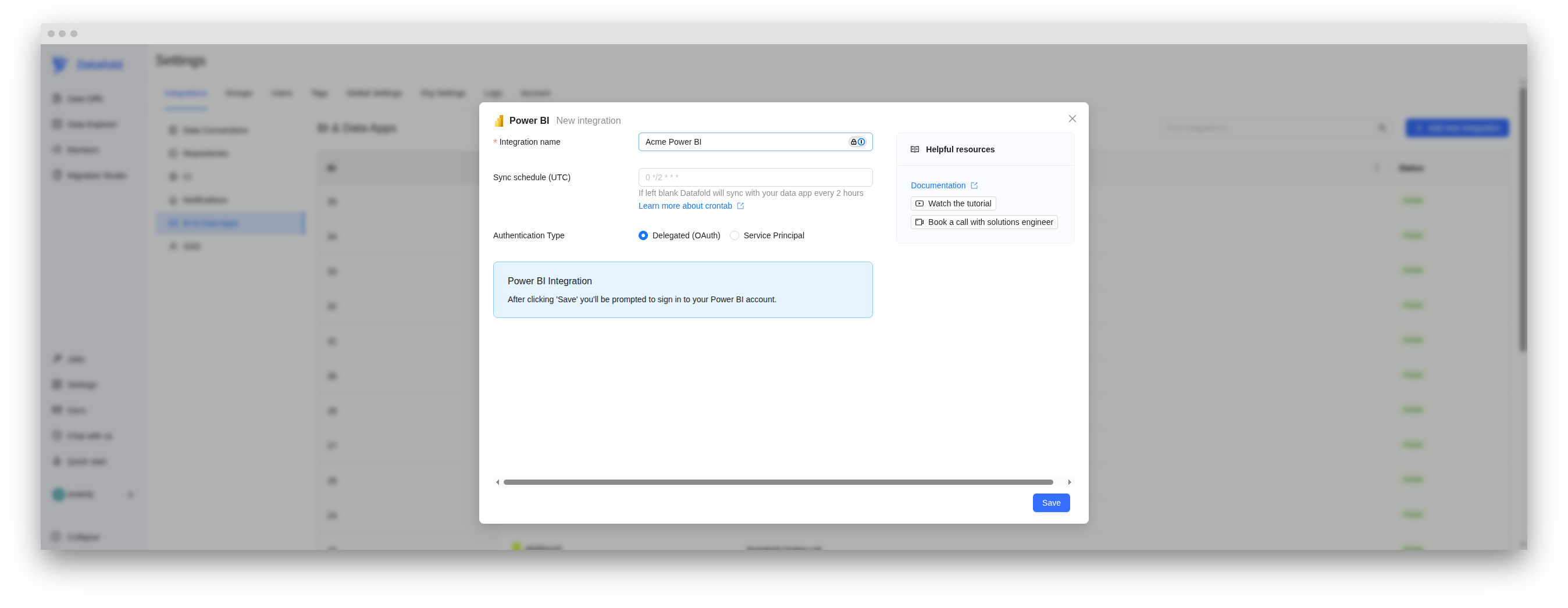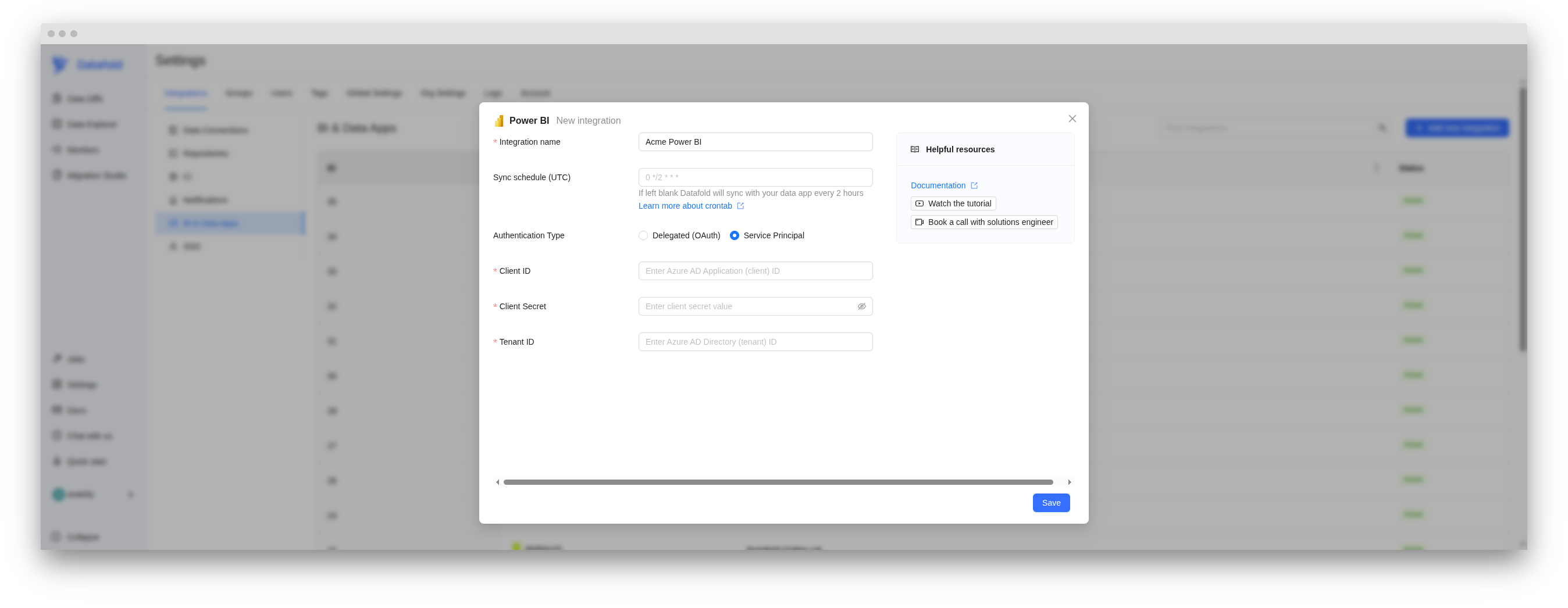 In the Datafold app, navigate to Settings -> BI & Data Apps, and click + Add new integration. Choose Power BI from the list.