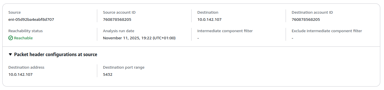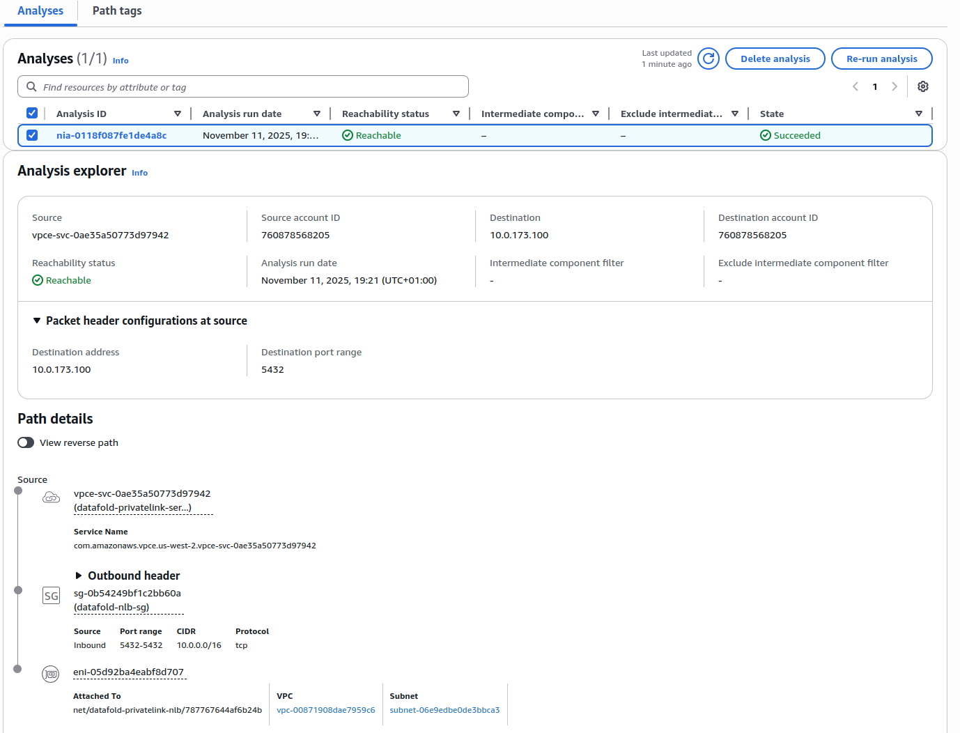 You can use AWS VPC Network Reachability Analyzer to verify that traffic can flow correctly through your PrivateLink setup. This is helpful for identifying security group or network ACL issues. Check 1: Verify NLB to Database connectivity- Navigate to VPC > Reachability Analyzer and click Create and analyze path