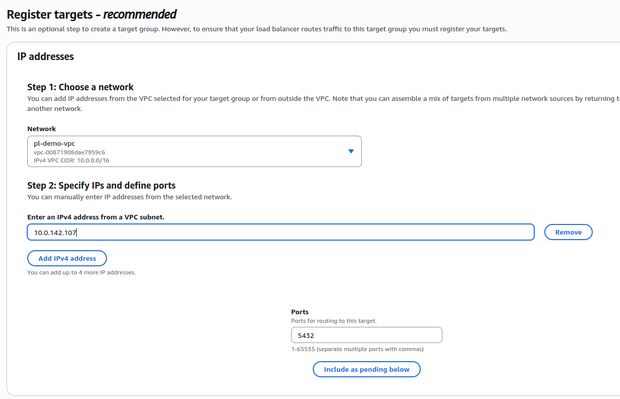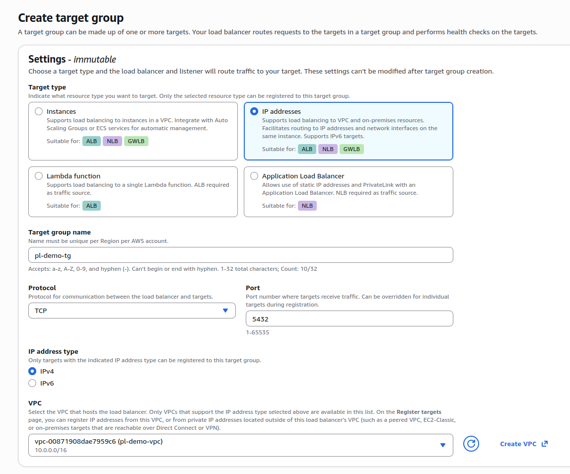 Create a target group that points to your database:- Navigate to EC2 > Target Groups and click Create target group