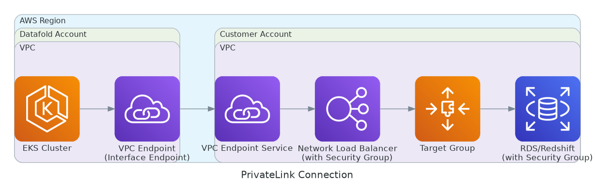 The setup involves creating a Network Load Balancer (NLB) and VPC Endpoint Service in your AWS account that Datafold can connect to via a VPC Endpoint.- Enhanced Security: Database traffic never traverses the public internet