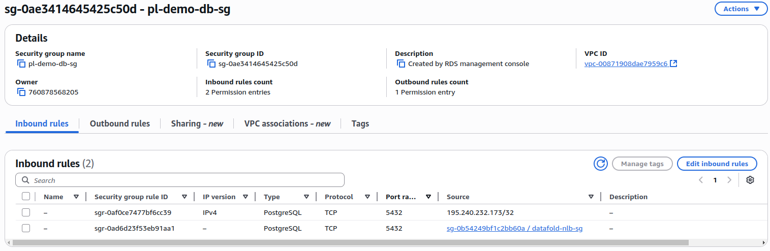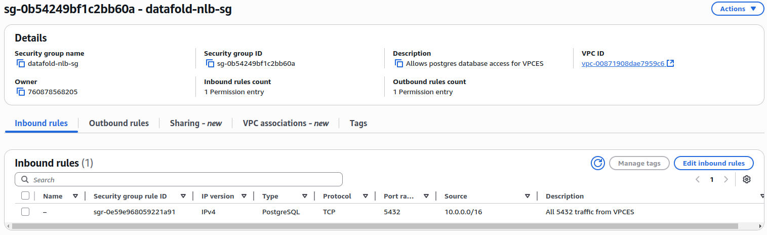 Check the security group attached to your database (RDS, Redshift, etc.) and ensure it allows inbound traffic on the database port from the NLB security group (which you created in Step 1). You can either use the ID of the NLB security group or use another appropriate CIDR range or security group id.