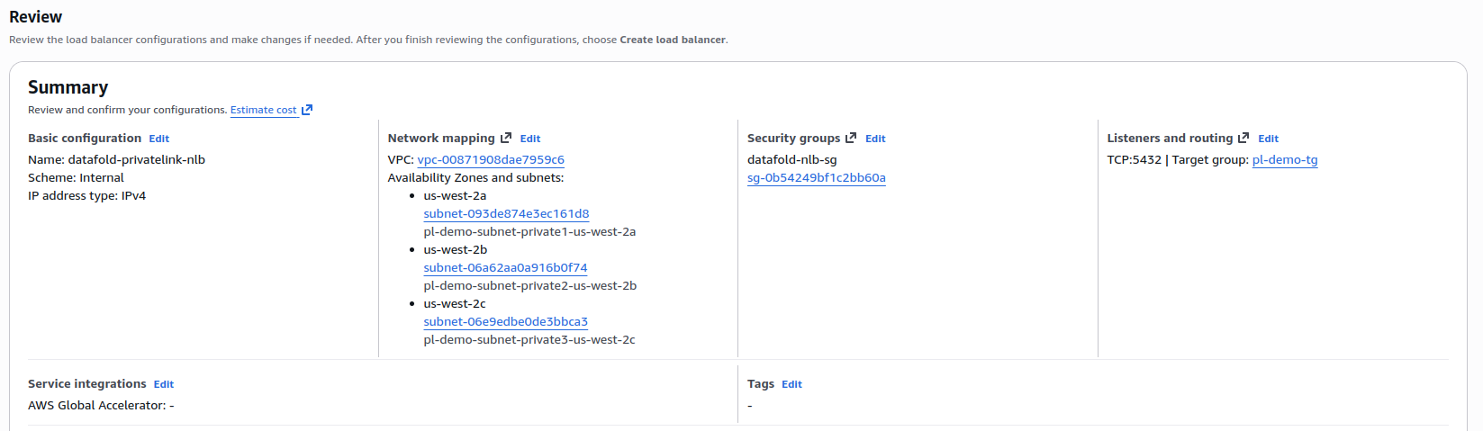 The components must be configured in this specific order, working from your data source backwards to the VPC Endpoint Service. This is because resources that you create in each step are used by resources that come before it.Step 1: Create NLB Security Group